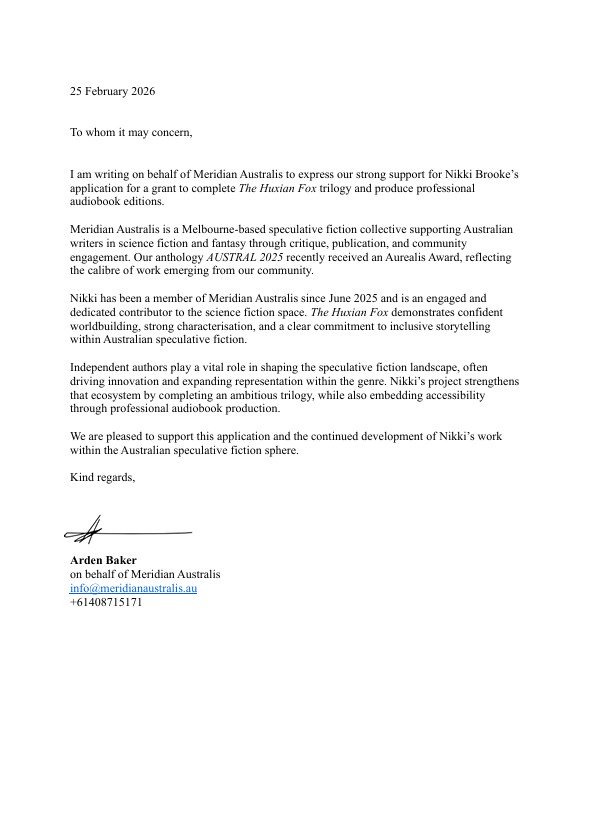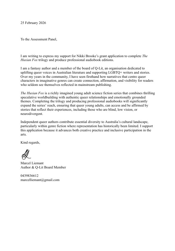 Nikki Brooke is an Australian author of young adult speculative fiction whose work centres diverse and inclusive storytelling, particularly within queer and culturally rich narratives. She has independently published two novels, Plagued Lands and The Huxian Fox, with the second due for release in 2026, and received accolades including an Aurealis Award shortlist for Plagued Lands and other industry recognition. With a background in community engagement and a growing presence across literary platforms and social media, Nikki combines narrative craft with professional practice, aiming to broaden access to speculative fiction through both print and audio formats.